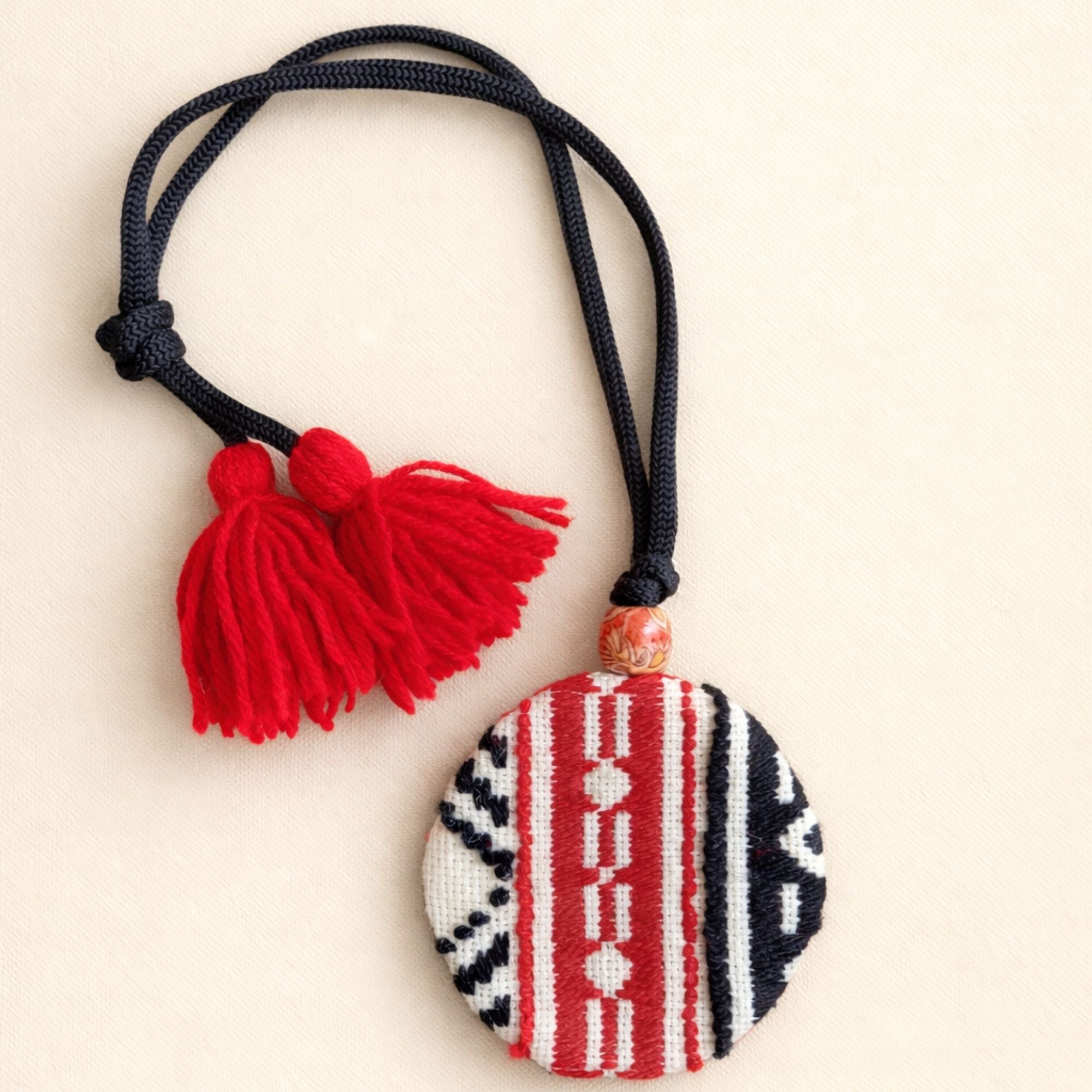 Hand embroidered luggage tag made by the Toda community of The Nilgiris.