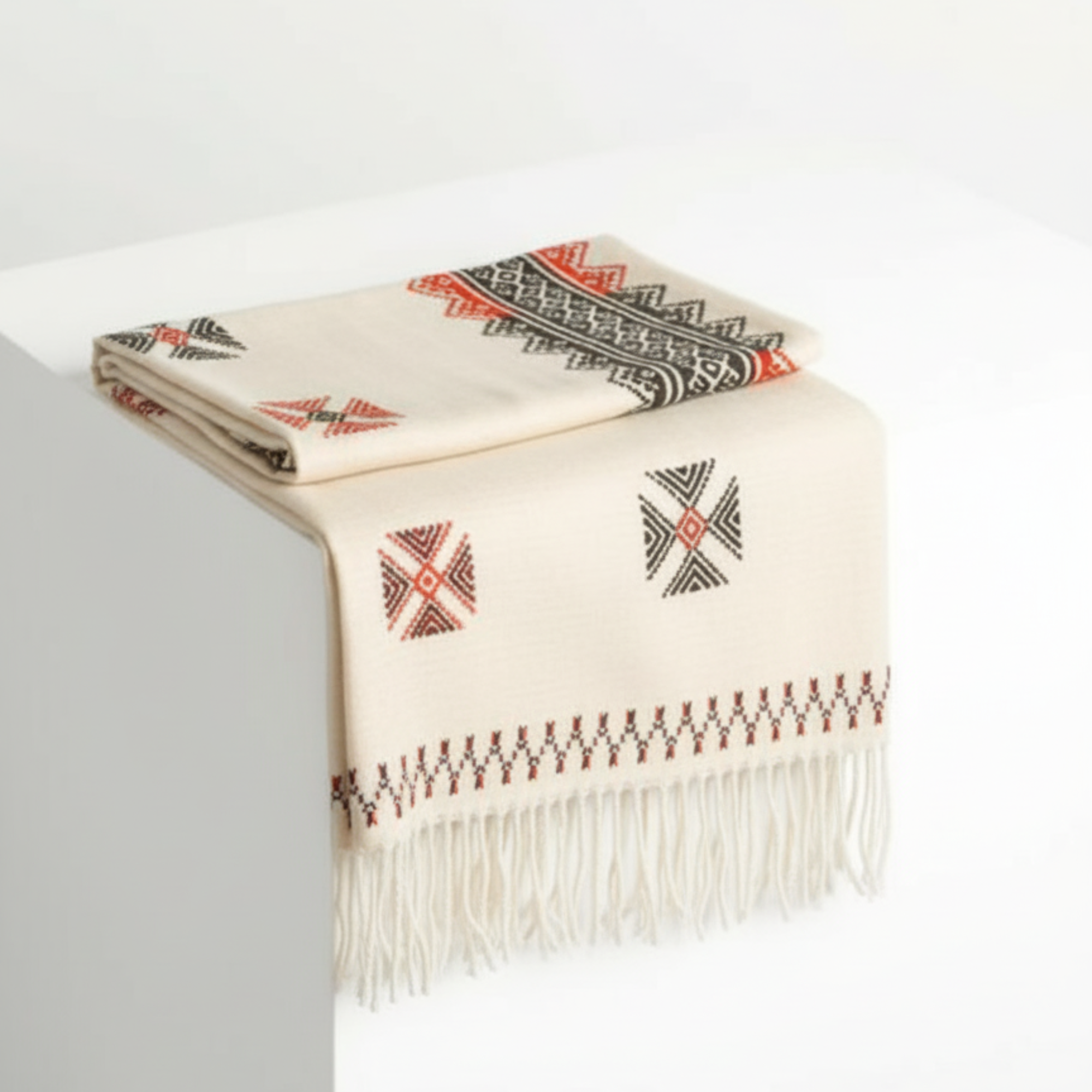 Hand embroidered shawl made by the Toda community of The Nilgiris. Embroidery on the actual product may vary from the image.