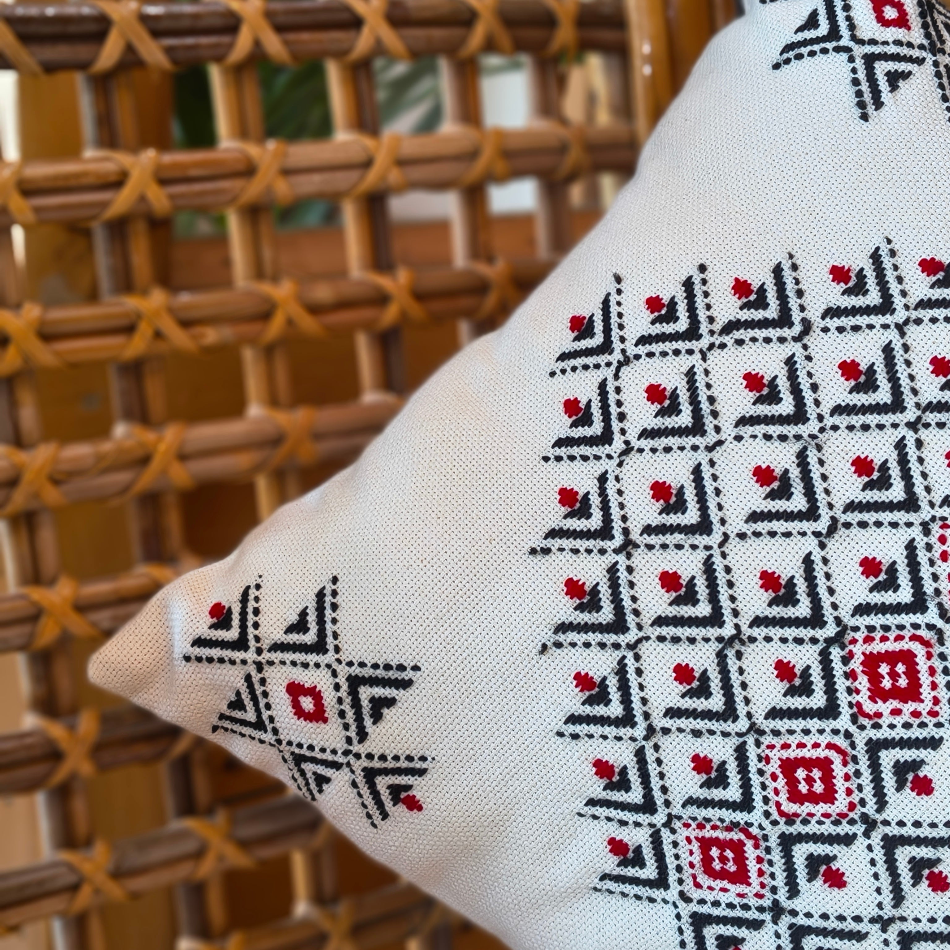 A symphony of geometric precision - this cushion cover features an interlocking diamond lattice with red center motifs, hand stitched by a Toda woman from the Nilgiris. Every square, every dot, placed entirely from memory. GI Certified. This pattern will never be made again.