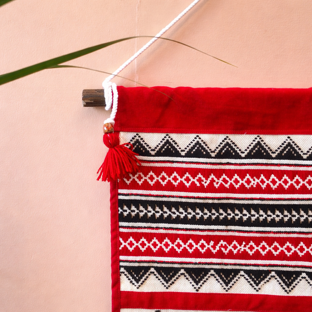 Handwoven by the women of the Toda community from the Nilgiri hills, this wall hanging brings the quiet strength of an ancient culture into your living space. The bold red base is accented with traditional black and white geometric motifs, patterns that have been passed down through generations and are deeply rooted in Toda identity.