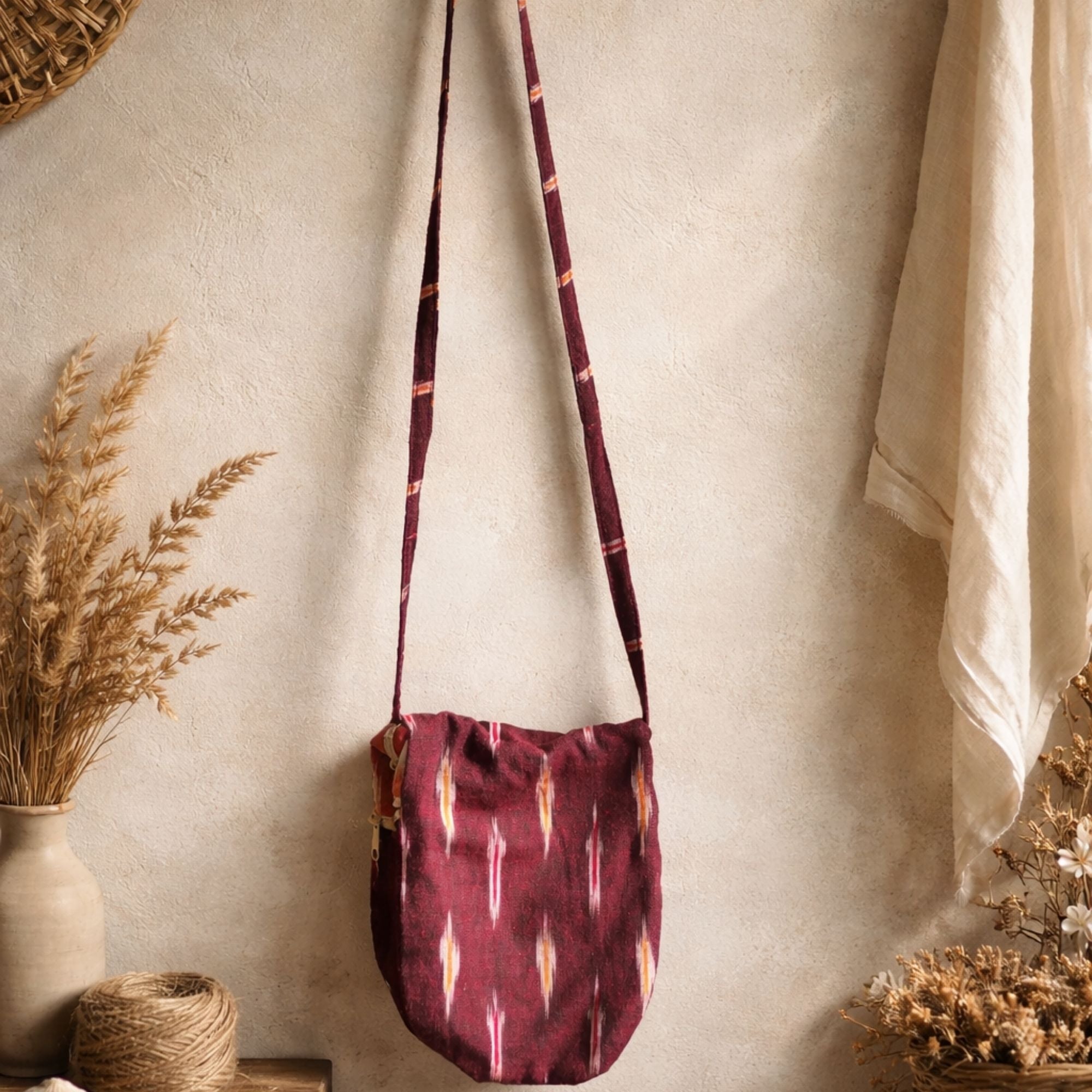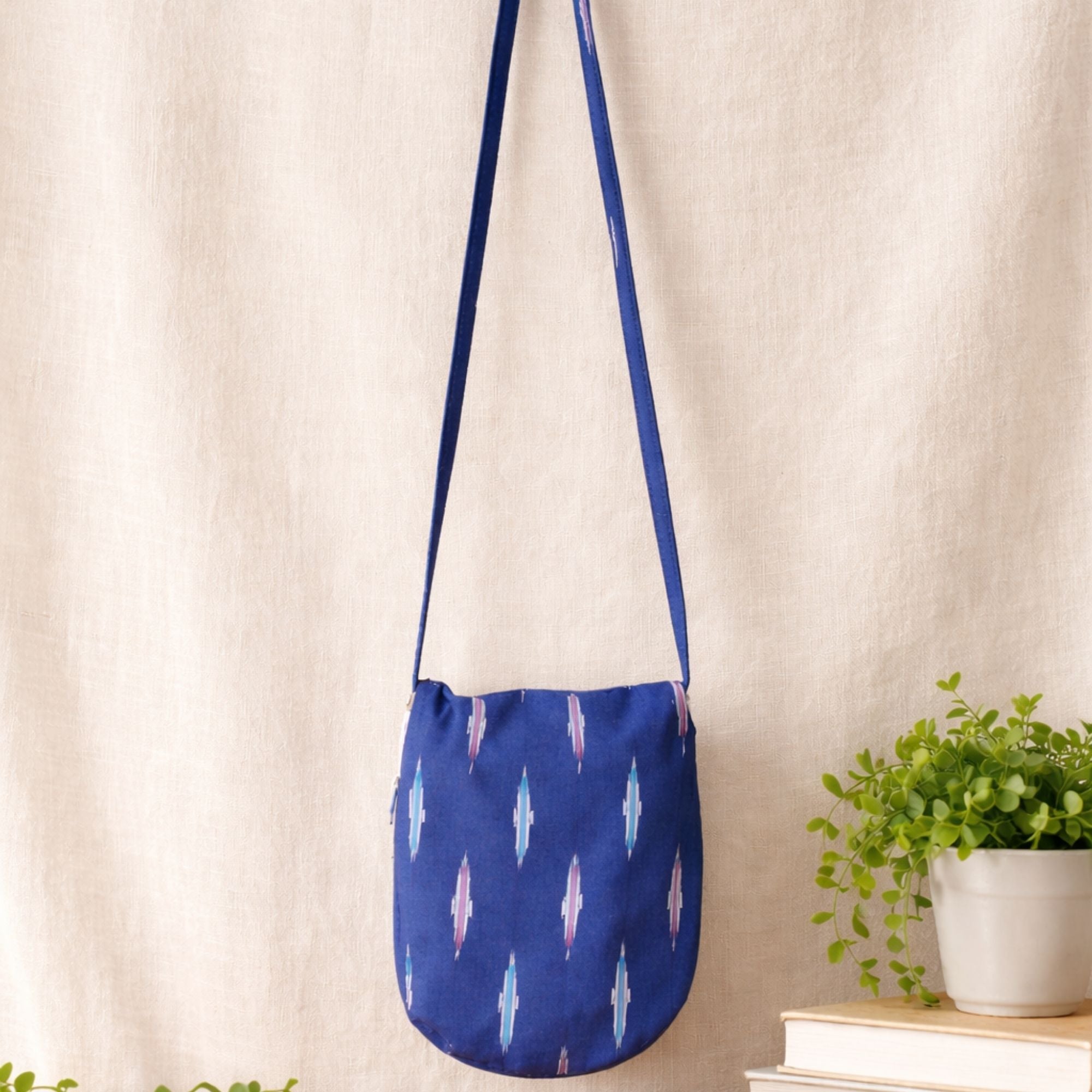 A compact and lightweight cell phone sling bag made from cotton fabric, featuring a traditional Kalamkari-inspired design. The bag comes with a zip closure to keep your phone and small essentials secure. Designed with a long sling strap for comfortable, hands-free carrying, it is ideal for everyday use, short outings, and travel. Simple, functional, and easy to carry.